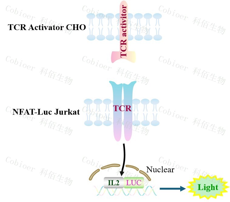 TCR Activator CHO 報(bào)告基因藥靶模型很好的模擬了體內(nèi) TCR 的信號(hào)轉(zhuǎn)導(dǎo)過(guò)程,原理見(jiàn)下圖所示。![]() Figure 1. TCR Activator CHO 細(xì)胞模型原理圖 |