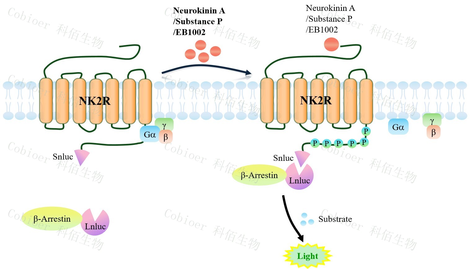NK2R β-Arrestin CHO 報(bào)告基因藥靶模型很好的模擬了體內(nèi) NK2R/β-Arrestin 的信號(hào)轉(zhuǎn) 導(dǎo)過程,原理見下圖所示。當(dāng)缺乏配體刺激時(shí),β-Arrestin 不與 NK2R 結(jié)合,融合β-Arrestin 的熒光素酶處于失活構(gòu)象,當(dāng) NK2R 遭遇配體刺激時(shí),融合熒光素酶報(bào)告基因的β-Arrestin 被招募,使熒光素酶報(bào)告基因處于激活狀態(tài),加入其底物后發(fā)光信號(hào)增強(qiáng)。