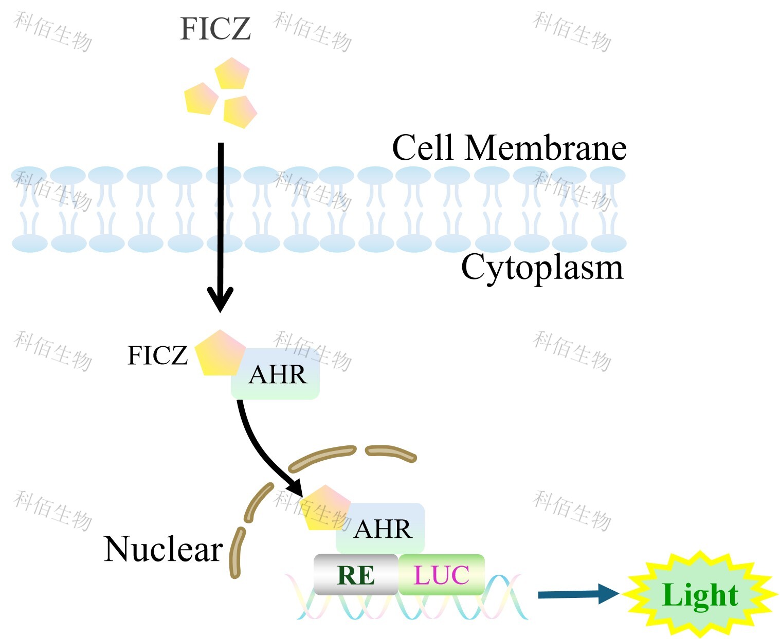 AHRE Luciferase Reporter HT29 藥靶細胞,在由調控因子調控并表達報 告基因的重組細胞上,穩(wěn)定表達人 AHRE。FICZ 是有效的芳烴受體 (AhR) 激動劑,原理見下圖所示。 ![]() Figure 1. AHRE Luciferase Reporter HT29 細胞的構建原理圖 |