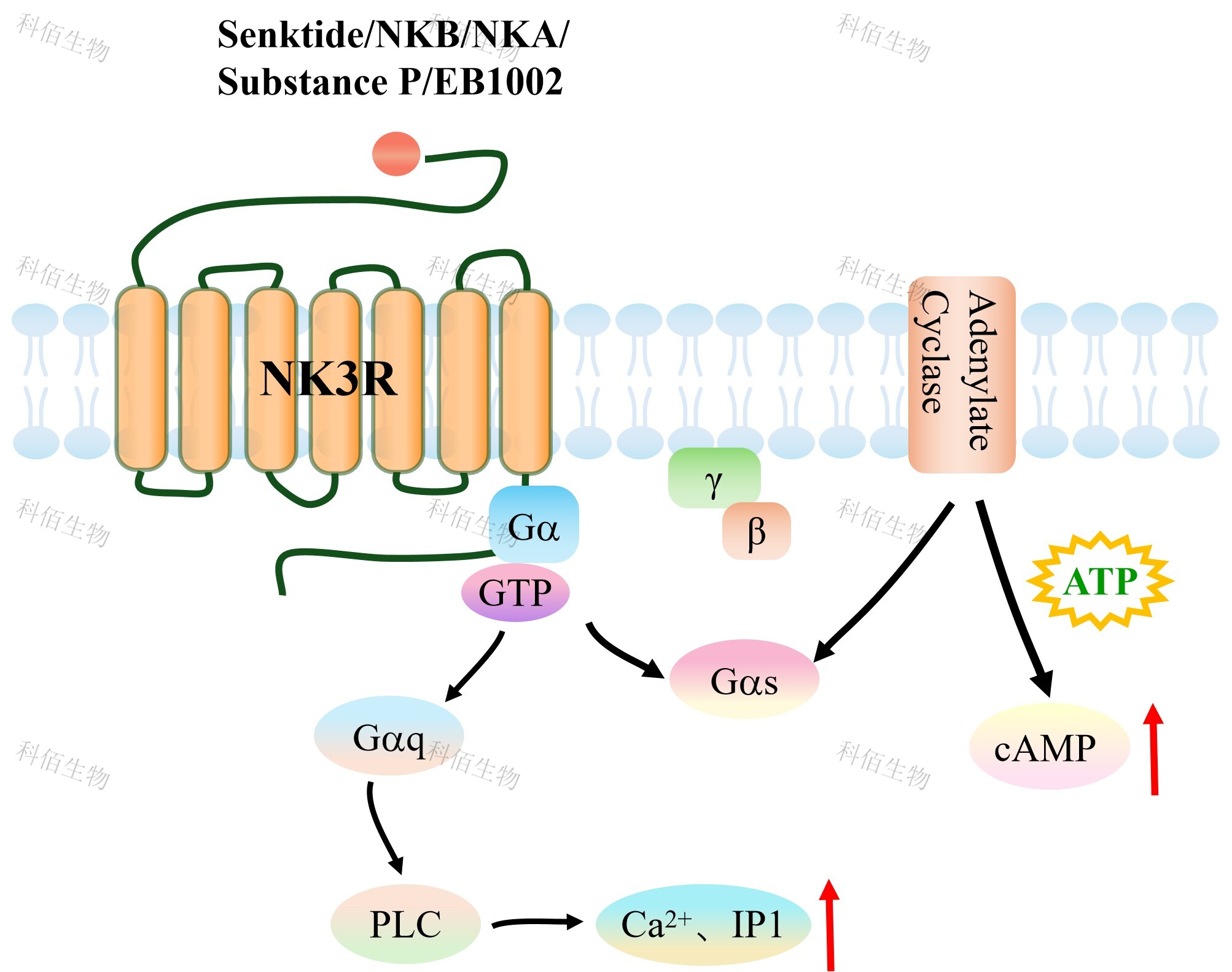 速激肽(Tachykinin)是在整個(gè)神經(jīng)和免疫系統(tǒng)中表達(dá)的神經(jīng)肽,作為興奮性神經(jīng)遞質(zhì), 它們?cè)谡{(diào)節(jié)各種生理功能中發(fā)揮重要的作用。在不同的速激肽中,P 物質(zhì)(SP)、神經(jīng)激 肽 A(NKA) 和 NKB 已得到充分研究。這些肽可以通過三種不同的 GPCR、神經(jīng)激肽 1 受體(NK1R)、神經(jīng)激肽 2 受體(NK2R) 和 NK3R 發(fā)揮作用。作為具有不同親和力的 完全激動(dòng)劑。 NK3R(Neurokinin 3 Receptor),又稱 TACR3,是速激肽受體家族的重要成員,屬于 GPCR 超家族。其內(nèi)源性配體為神經(jīng)激肽 B(Neurokinin B, NKB),通過激活下游信號(hào)通 路參與生殖調(diào)控、神經(jīng)內(nèi)分泌調(diào)節(jié)及多種疾病進(jìn)程。近年來,NK3R 成為治療更年期癥狀、 神經(jīng)精神疾病及癌癥的熱門靶點(diǎn)。 |