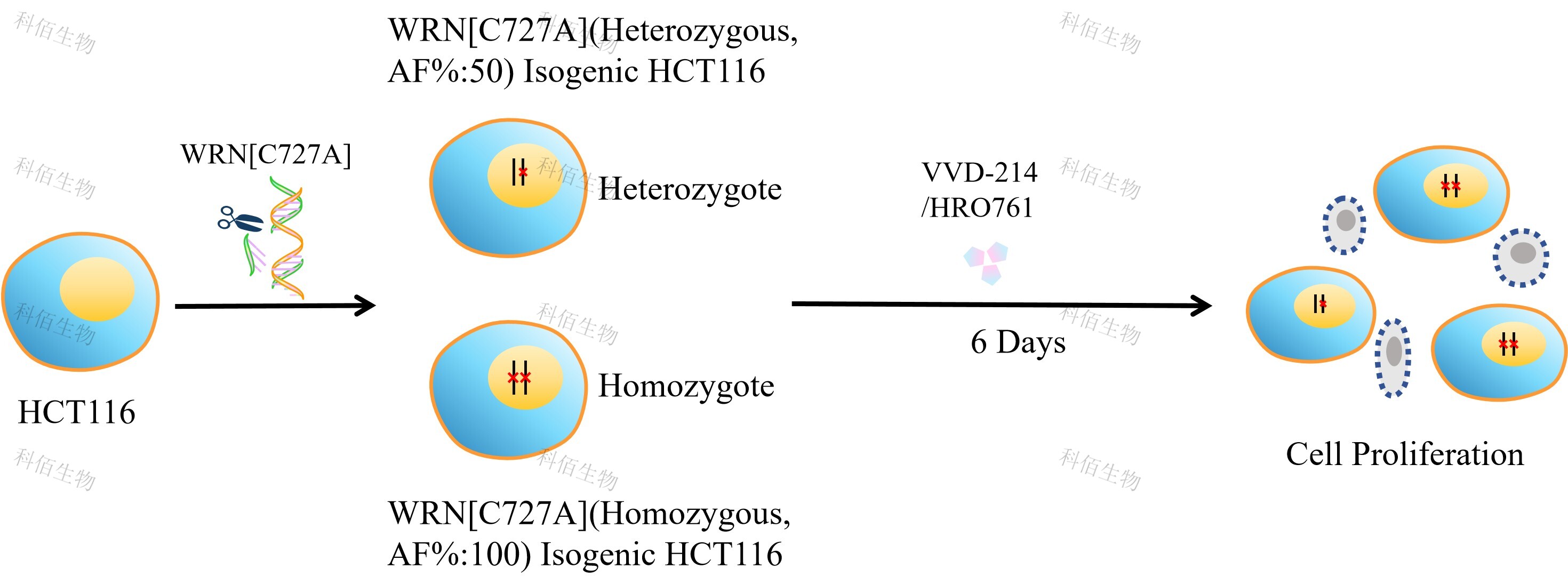 WRN[C727A](Homozygous,AF%:100) Isogenic HCT116 藥靶細胞,通過 基因編輯的方式將 WRN 的 727 位氨基酸胱氨酸(C)突變?yōu)楸彼幔ˋ)。![]() Figure 1. WRN[C727A](Homozygous,AF%:100) Isogenic HCT116 原理示意圖 |