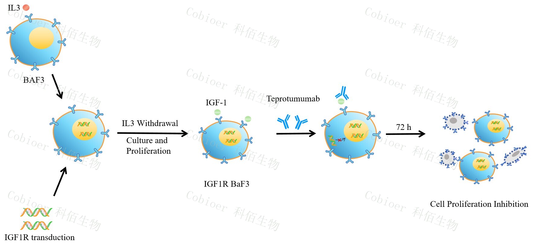 BaF3(小鼠原 B 細(xì)胞)的生長(zhǎng)和增殖需要 IL-3 的維持。通過(guò)引入各種表達(dá)激酶的基因, 能作為 BaF3 的驅(qū)動(dòng)基因,讓 BaF3 不再依賴(lài) IL-3 而增殖,進(jìn)而激酶基因成為 BaF3 增殖依 賴(lài)的驅(qū)動(dòng)基因,用于評(píng)估小分子藥物對(duì)激酶的靶向抑制作用,原理及流程見(jiàn)下圖所示。![]() Figure 1. IGF1R BaF3 細(xì)胞模型原理圖 |