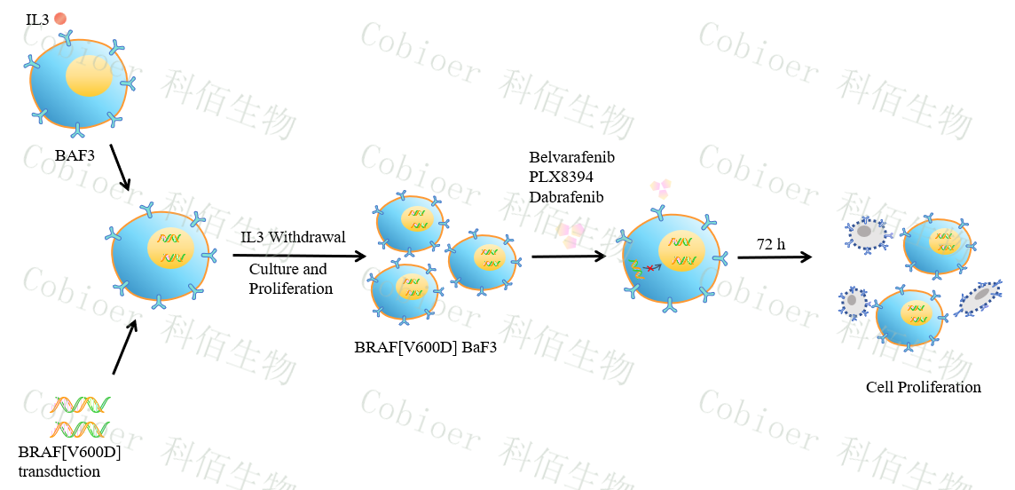 BaF3(小鼠原 B 細胞)的生長和增殖需要 IL-3 的維持。通過引入各種表達激酶的基因, 能作為 BaF3 的驅(qū)動基因,讓 BaF3 不再依賴 IL-3 而增殖,進而激酶基因成為 BaF3 增殖依 賴的驅(qū)動基因,用于評估小分子藥物對激酶的靶向抑制作用,原理及流程見下圖所示。