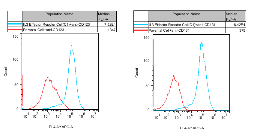 ![]() Figure 2. Recombinant IL3 Effector Reporter Cell stably expressing IL3. ![]() Figure 3. Dose Response of Recombinant Human IL3 in IL3 Effector Reporter Cell(C1). ![]() Figure 4. Inhibition of Human IL3 induced Reporter Activity by CD123&CD1D131 Blocking Abs in IL3 Effector Reporter Cell(C1). |