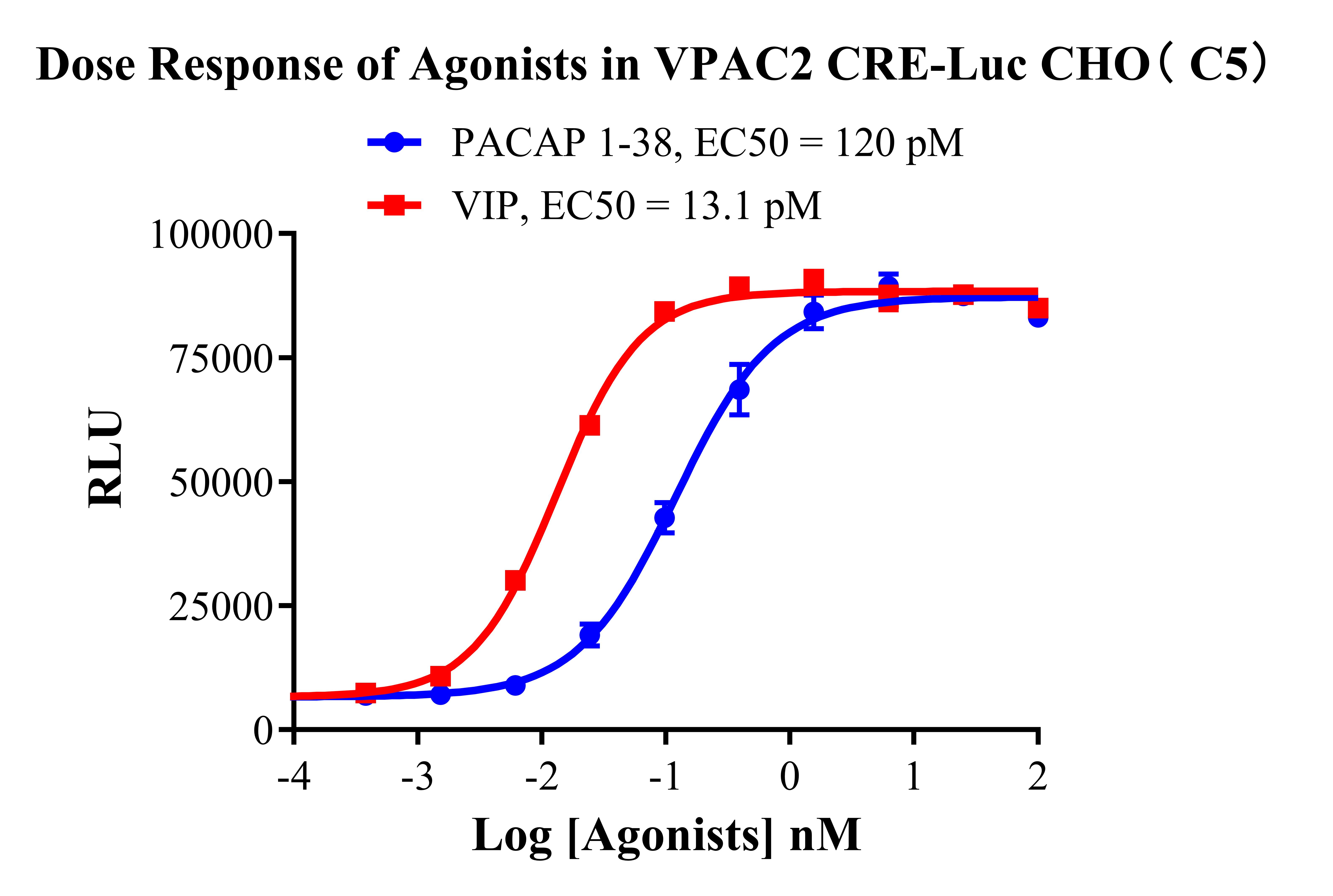 VPAC2 CRE-Luc CHO 報告基因藥靶模型很好的模擬了體內 VPAC2 的信號轉導過程, 原理見下圖所示。![]() Figure 1. VPAC2 CRE-Luc CHO 細胞模型原理圖 |