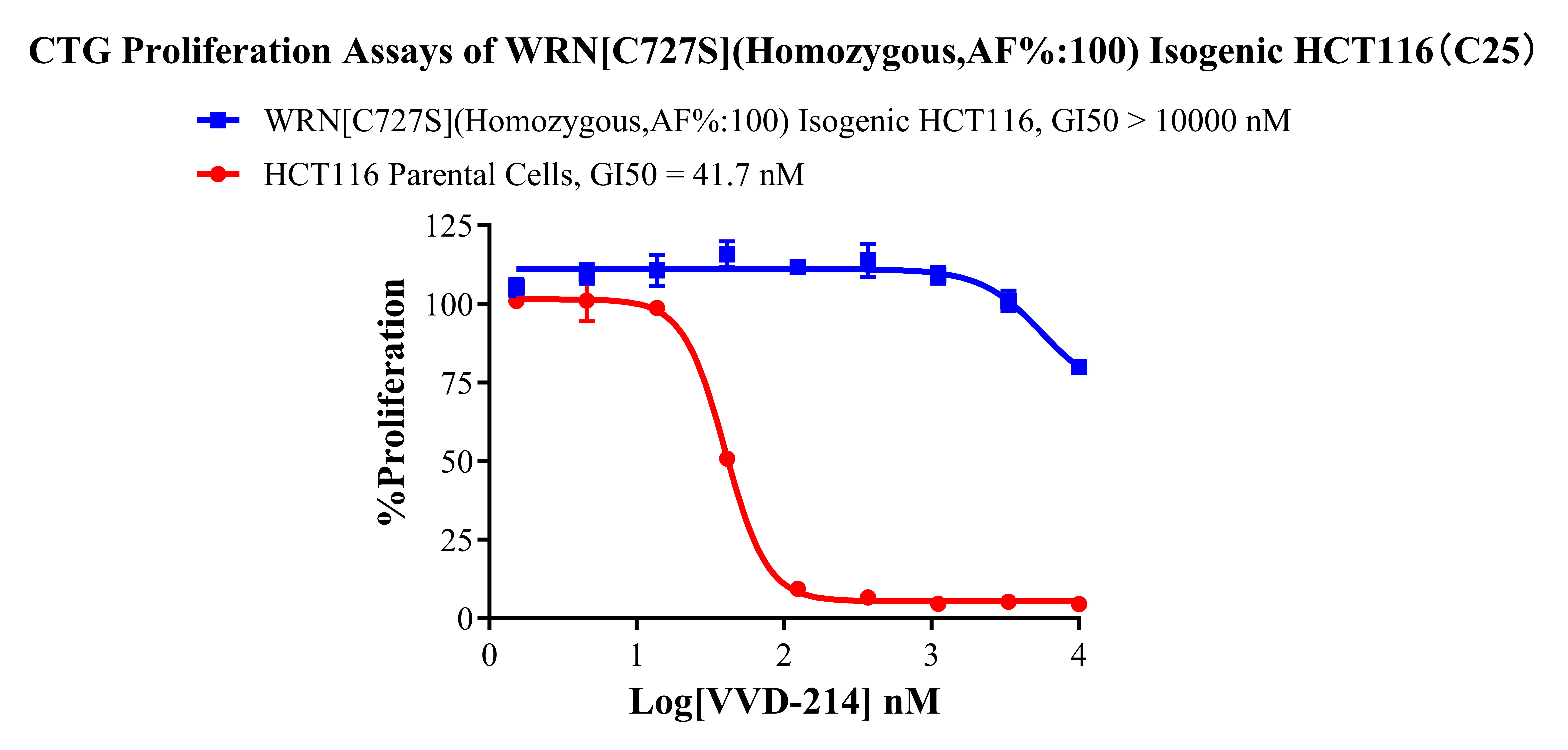 WRN[C727S](Homozygous,AF%:100) Isogenic HCT116 藥靶細胞,通過基因編輯的方式將 WRN 的 727 位氨基酸胱氨酸(C)突變?yōu)榻z氨酸(S)。![]() Figure 1. WRN[C727S](Homozygous,AF%:100) Isogenic HCT116 原理示意圖 |