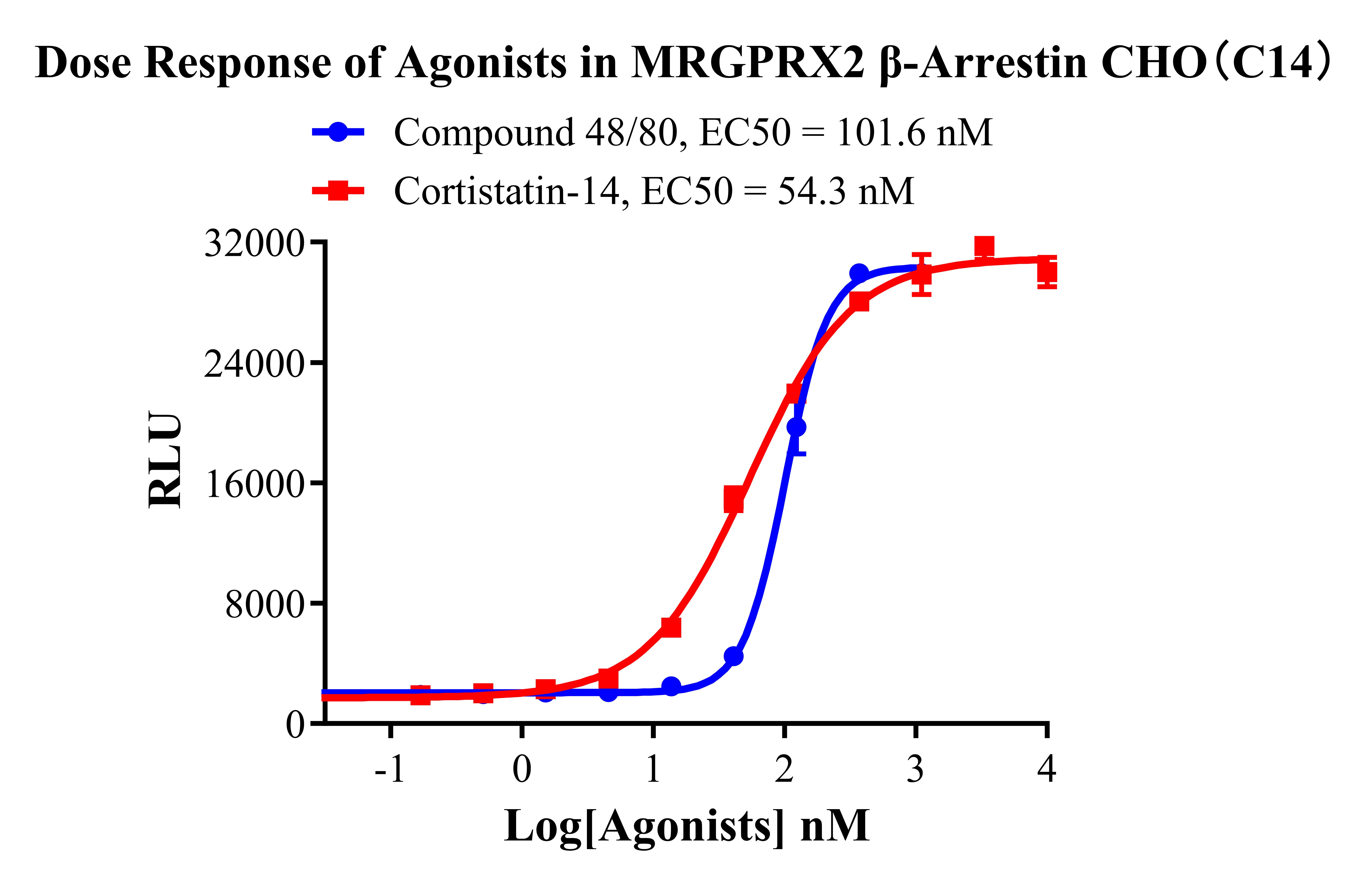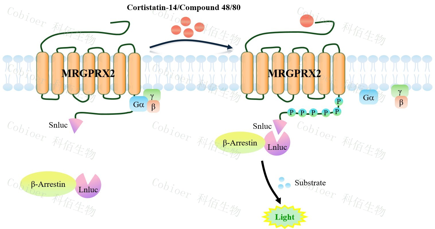 MRGPRX2 β-Arrestin CHO 報告基因藥靶模型很好的模擬了體內 MRGPRX2/β-Arrestin 的信號轉導過程,原理見下圖所示。當缺乏配體刺激時,β-Arrestin 不與 MRGPRX2 結合, 融合β-Arrestin 的熒光素酶處于失活構象;當 MRGPRX2 遭遇配體刺激時,融合熒光素酶報 告基因的β-Arrestin 被招募,使熒光素酶報告基因處于激活狀態(tài),加入其底物后發(fā)光信號增 強。![]() Figure 1. MRGPRX2 β-Arrestin CHO 細胞模型原理圖 |