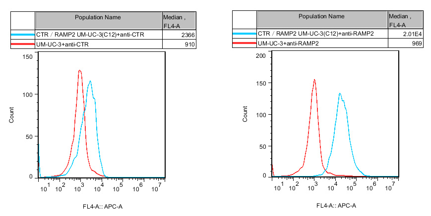 CTR&RAMP2 UM-UC-3 細(xì)胞藥靶模型很好的模擬了體內(nèi) CTR&RAMP2 的信號(hào)轉(zhuǎn)導(dǎo)過程,原理見下圖所示。![]() Figure 1. CTR&RAMP2 UM-UC-3 細(xì)胞流式驗(yàn)證 CTR 和 RAMP2 的表達(dá) |
