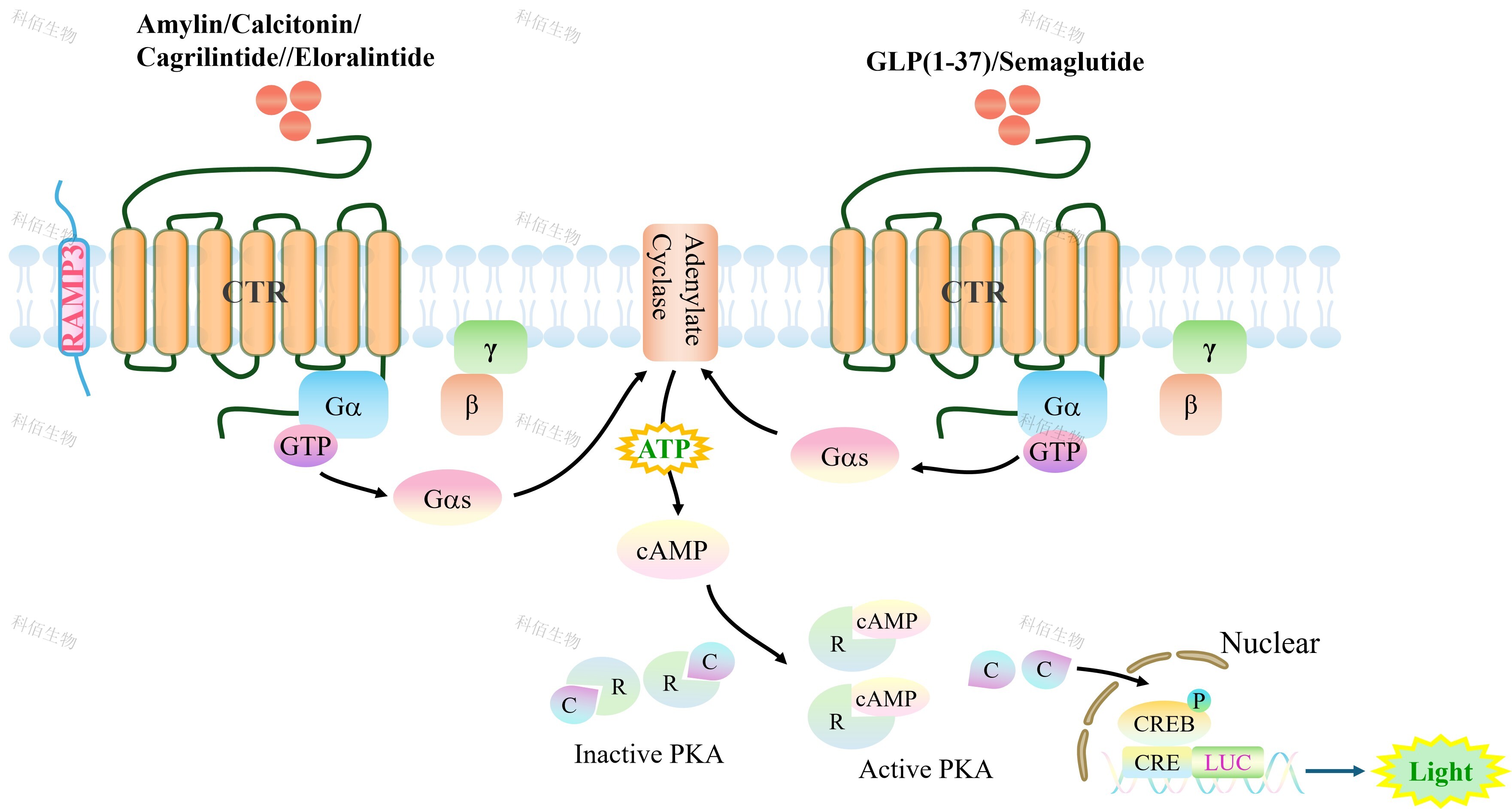 GLP1R&CTR/RAMP3 Dual Reporter Cell 報(bào)告基因藥靶模型很好的模擬了體內(nèi)GLP1R&CTR/RAMP3 的信號(hào)轉(zhuǎn)導(dǎo)過(guò)程,原理見(jiàn)下圖所示。