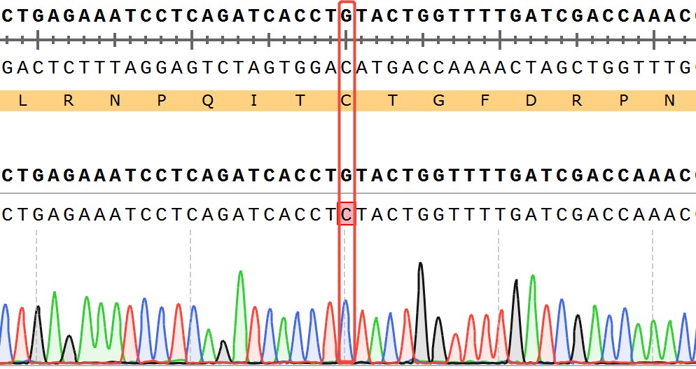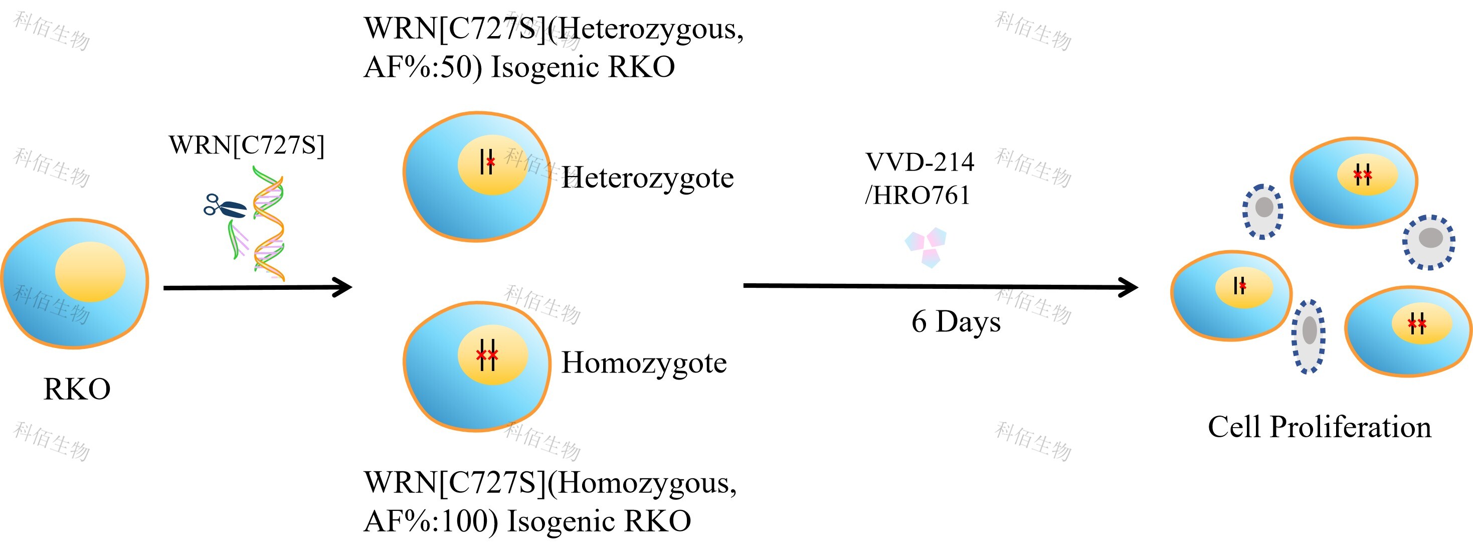 WRN[C727S](Homozygous,AF%:100) Isogenic RKO藥靶細(xì)胞,通過基因 編輯的方式將WRN的727位氨基酸半胱氨酸(C)突變?yōu)榻z氨酸(S)。![]() Figure 1. WRN[C727S](Homozygous,AF%:100) Isogenic RKO原理示意圖 |