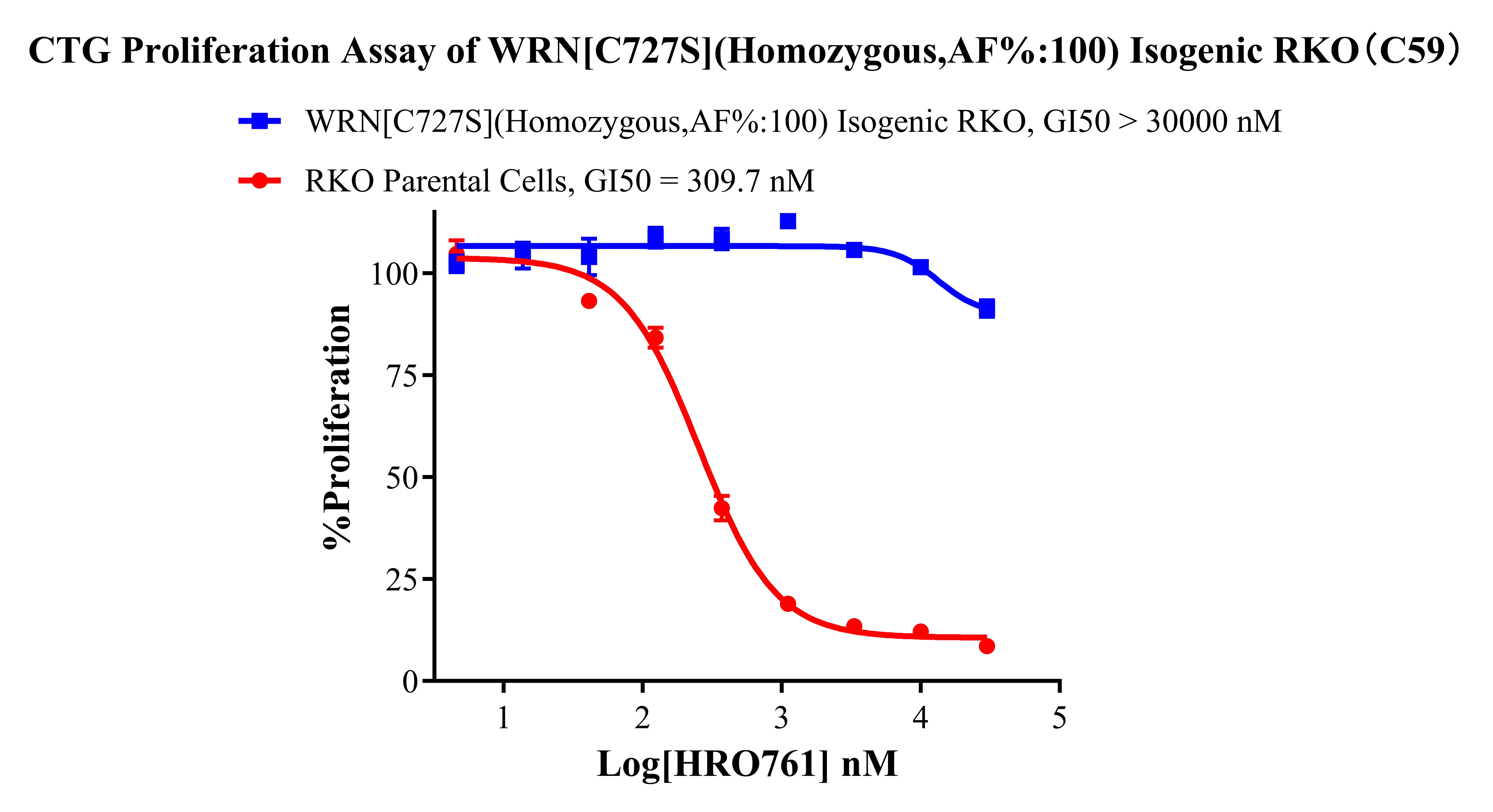 ![]() Figure 2. Sanger of WRN[C727S](Homozygous,AF%:100) Isogenic RKO. ![]() Figure 3. WRN[C727S](Homozygous,AF%:100) Isogenic RKO ddPCR結(jié)果 A:RKO Parental Cell;B:WRN[C727S](Homozygous,AF%:100) Isogenic RKO 通道1藍(lán)色微滴代表WRN[C727S]突變陽性,通道2綠色微滴代表該位點為陰性野生型 ![]() Figure 4. CTG Proliferation Assay of WRN[C727S](Homozygous,AF%:100) Isogenic RKO(C59). ![]() Figure 5. CTG Proliferation Assay of WRN[C727S](Homozygous,AF%:100) Isogenic RKO(C59). |