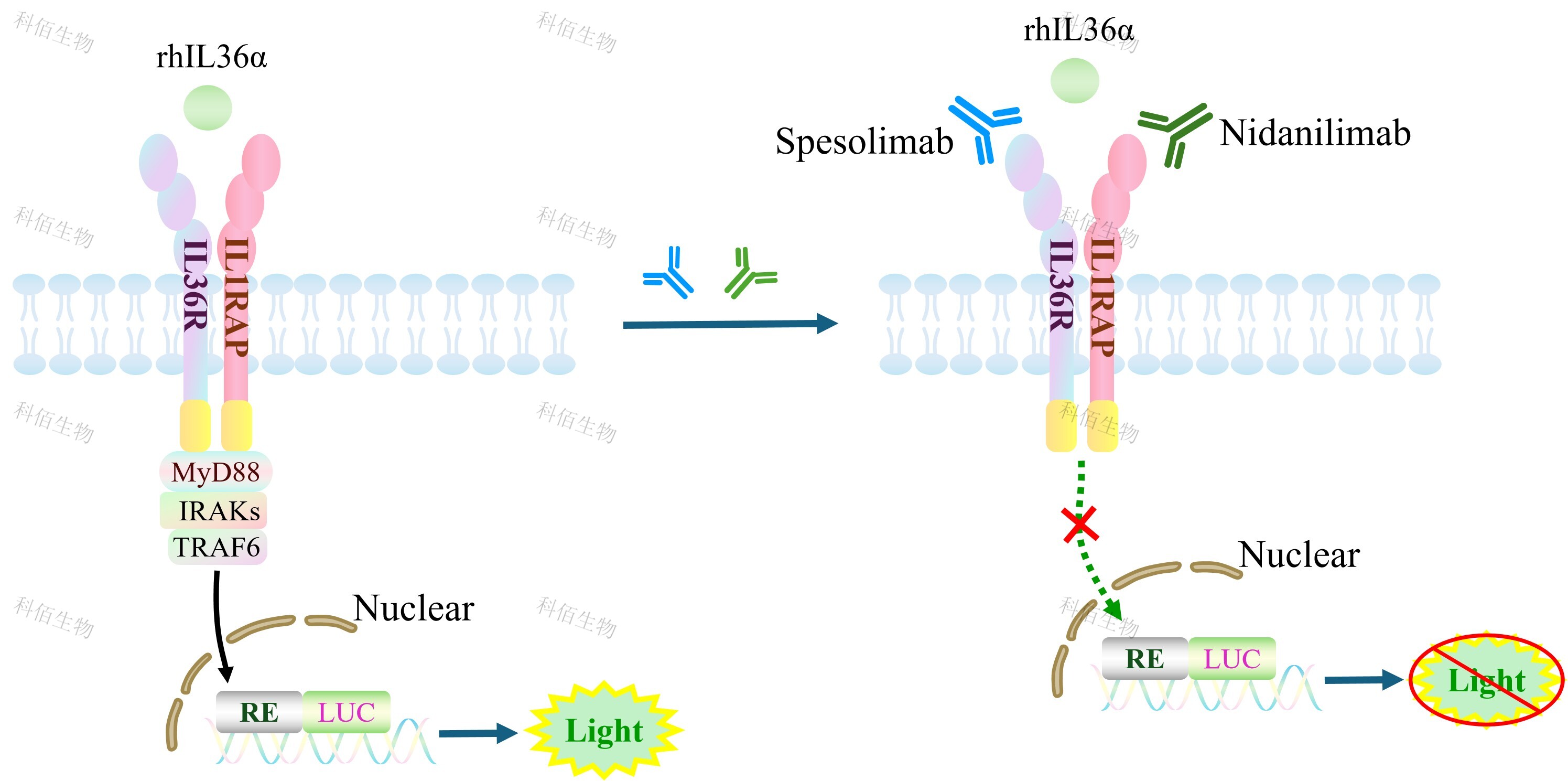 IL36 Effector Reporter Cell(Adherent)報(bào)告基因藥靶模型很好的模擬了體內(nèi) IL36 的信號(hào)轉(zhuǎn)導(dǎo)過程,原理見下圖所示。![]() Figure 1. IL36 Effector Reporter Cell(Adherent)細(xì)胞模型原理圖 |