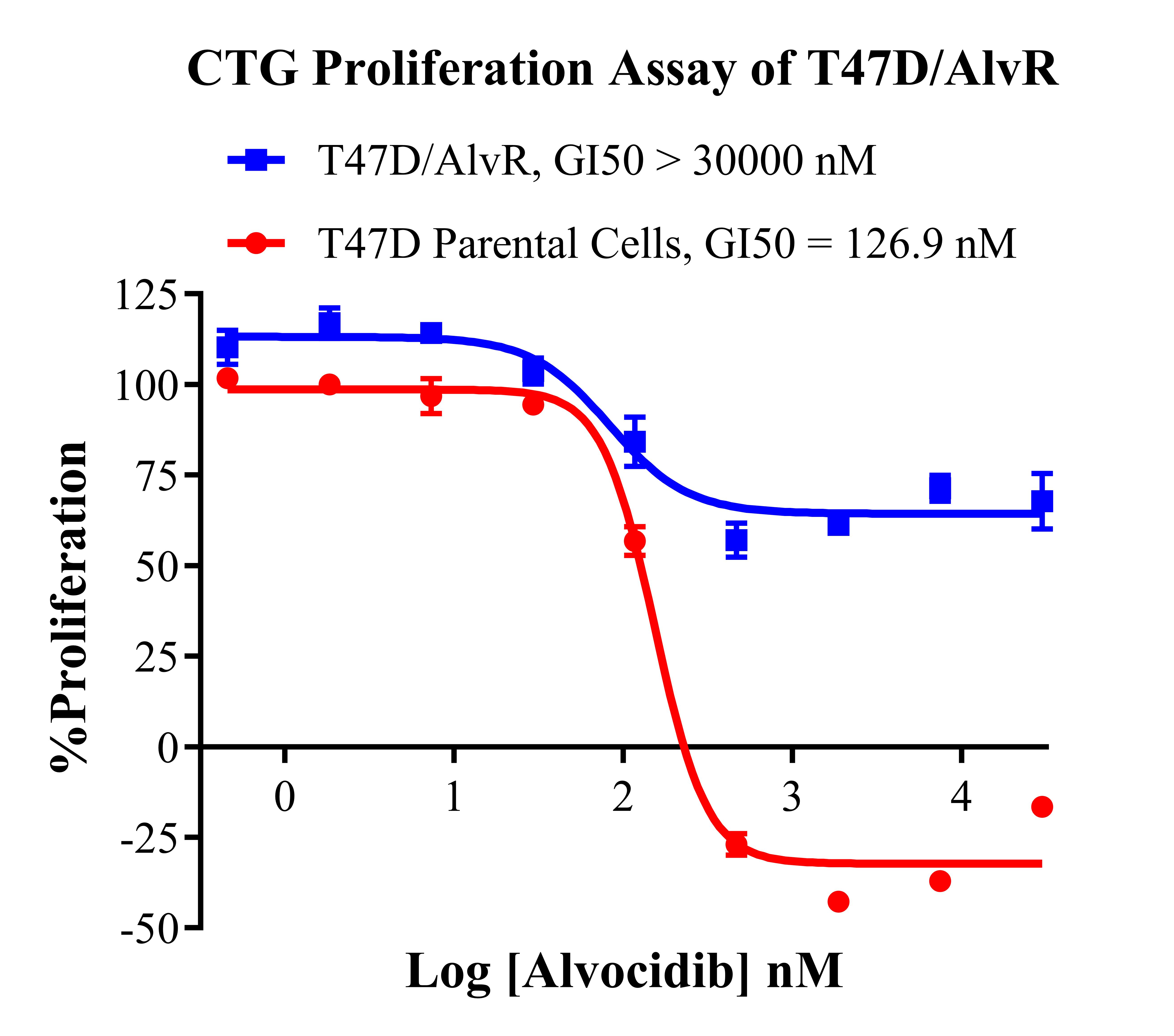 | T47D/AlvR 細胞,是經(jīng)過長時間持續(xù)的 Alvocidib 誘導產生的穩(wěn)定耐藥株。 | |