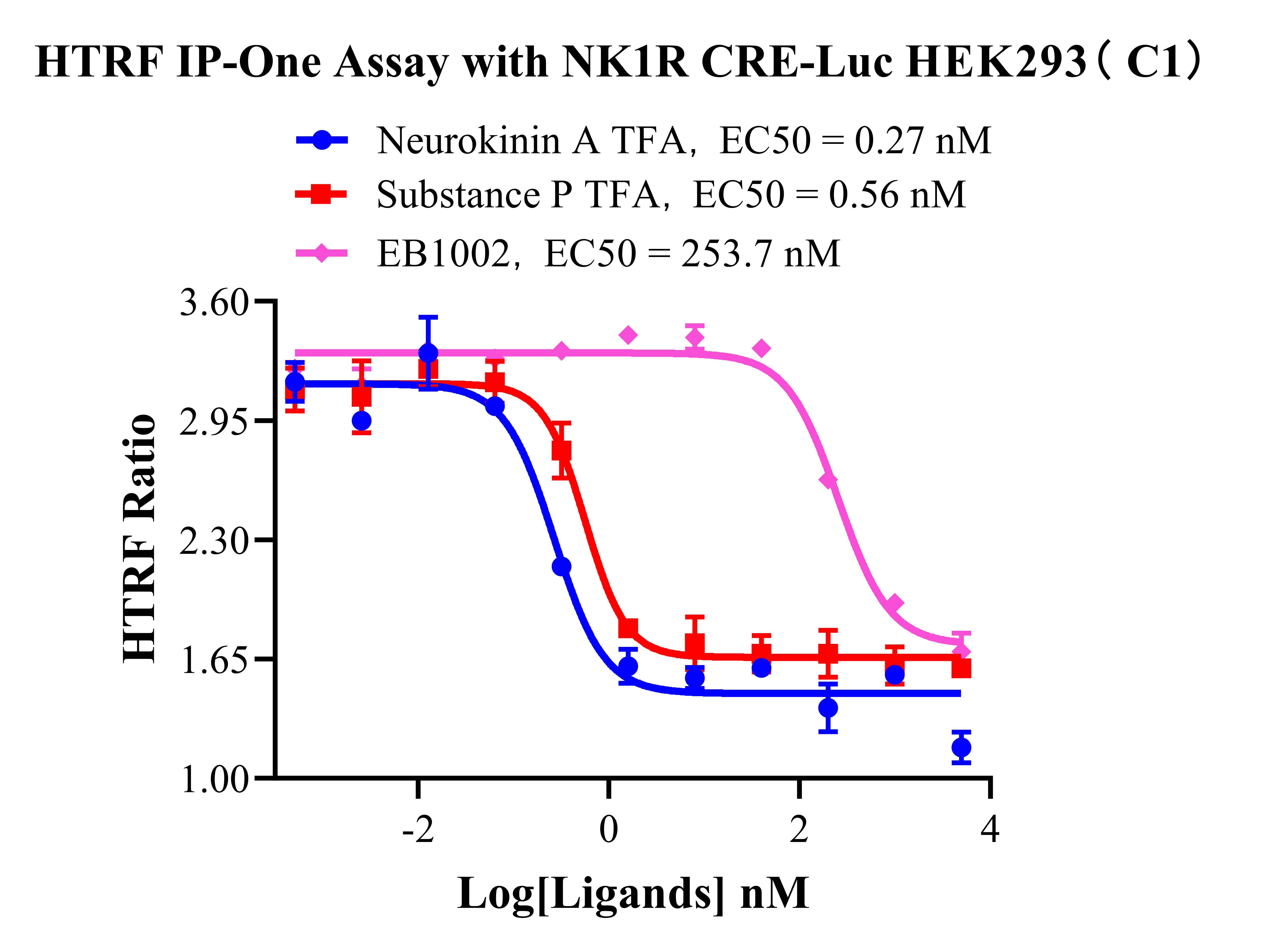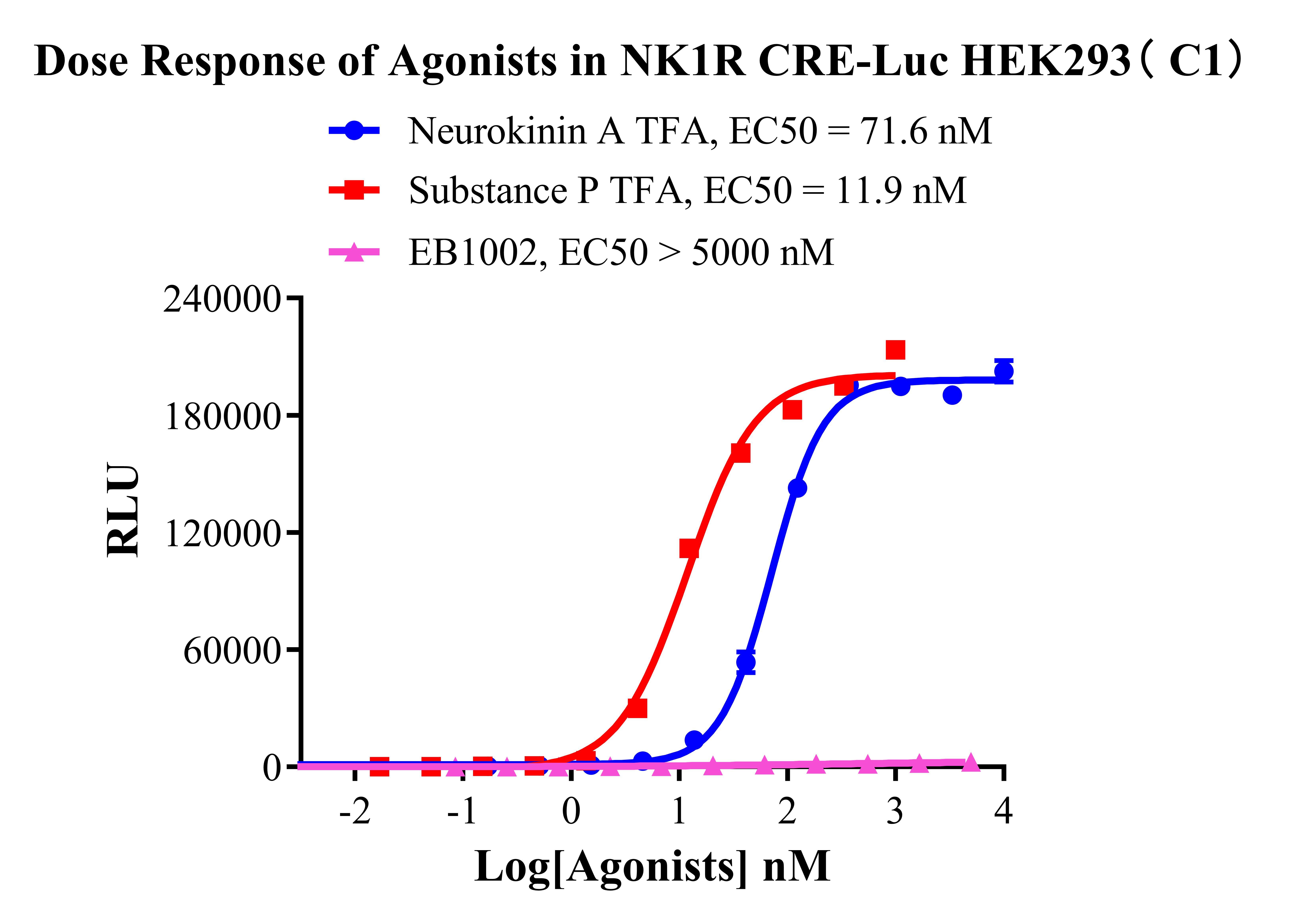 速激肽(Tachykinins )是分布在哺乳動(dòng)物中樞和周?chē)窠?jīng)系統(tǒng)中的一類神經(jīng)肽。速激 肽物質(zhì) P(SP)、神經(jīng)激肽 A(NKA)和神經(jīng)激肽 B(NKB)共享一個(gè)保守的 C 端基序, 對(duì)速激肽受體(NK1R、NK2R 和 NK3R)的激活至關(guān)重要。NKA 優(yōu)先激活與 Gα偶聯(lián)的 NK2R,而 SP 和 NKB 分別優(yōu)先結(jié)合 NK1R 和 NK3R。三種速激肽都能夠在所有速激肽受 體類型中表現(xiàn)為完全激動(dòng)劑。 |