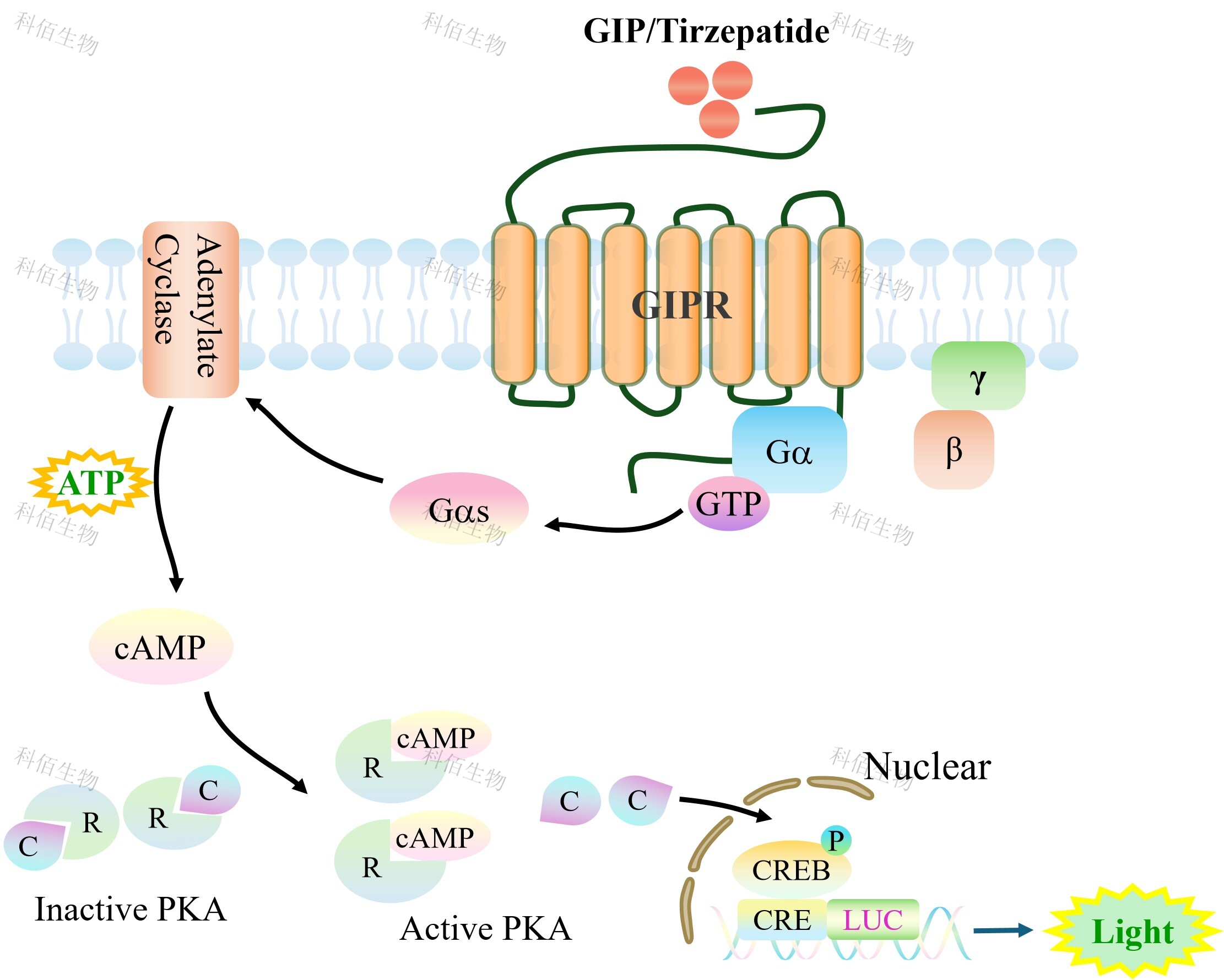 GIPR CRE-Luc HEK293 報(bào)告基因藥靶模型很好的模擬了體內(nèi) GIPR 的信號(hào)轉(zhuǎn)導(dǎo)過程, 原理見下圖所示。