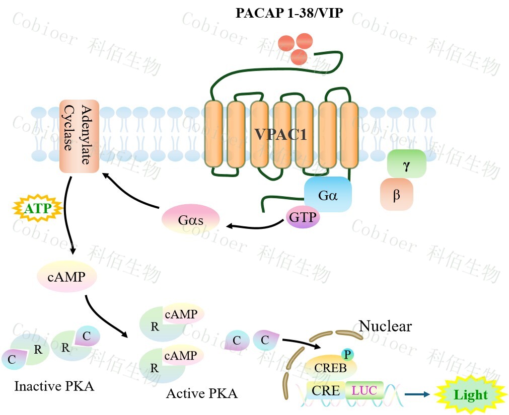 VPAC1 CRE-Luc HEK293 報告基因藥靶模型很好的模擬了體內(nèi) VPAC1 的信號轉(zhuǎn)導(dǎo)過程,原理見下圖所示。![]() Figure 1. VPAC1 CRE-Luc HEK293 細(xì)胞模型原理圖 |