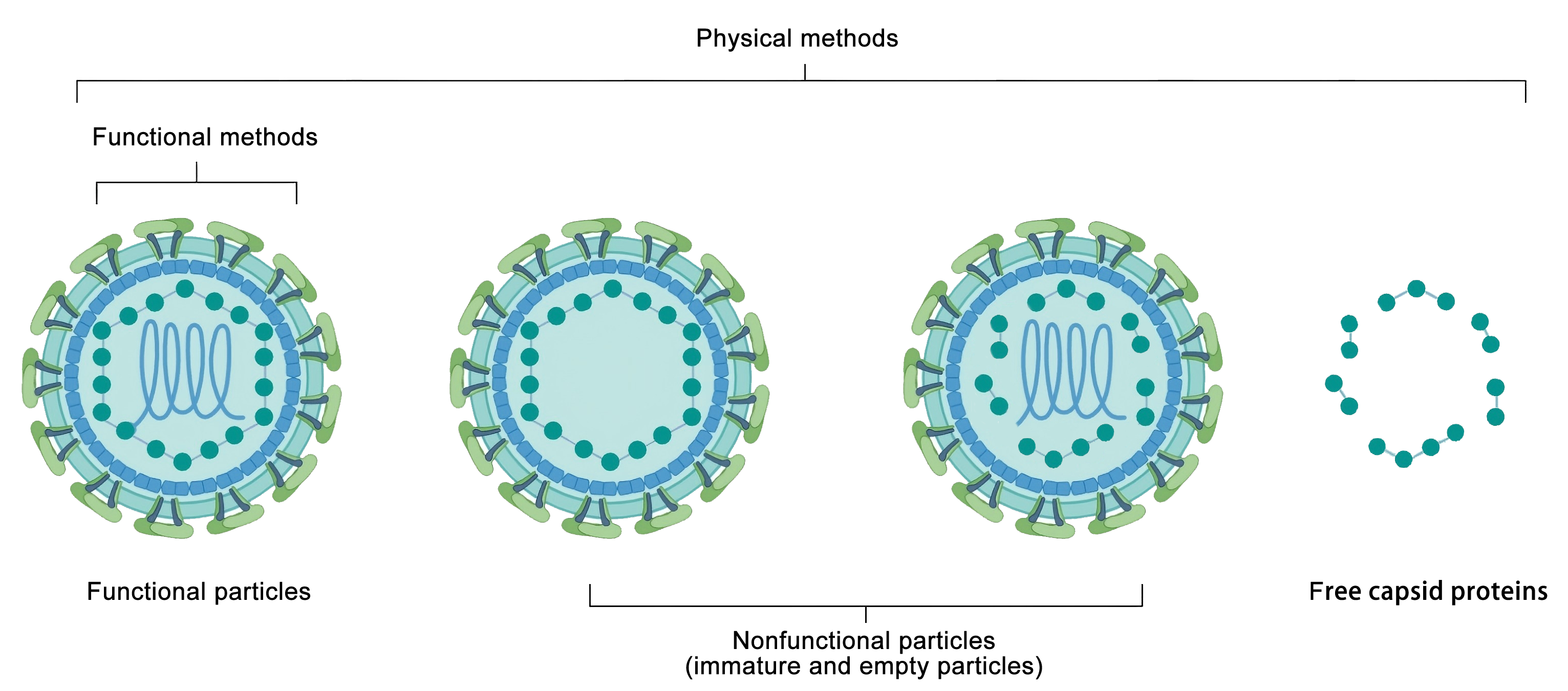 圖7 慢病毒包裝上清液中存在的產(chǎn)物。物理方法可以測(cè)量上清液中釋放的功能性和非功能性顆粒,以及游離衣殼蛋白(例如 p24)。功能性滴定方法專門測(cè)量功能性病毒顆粒。