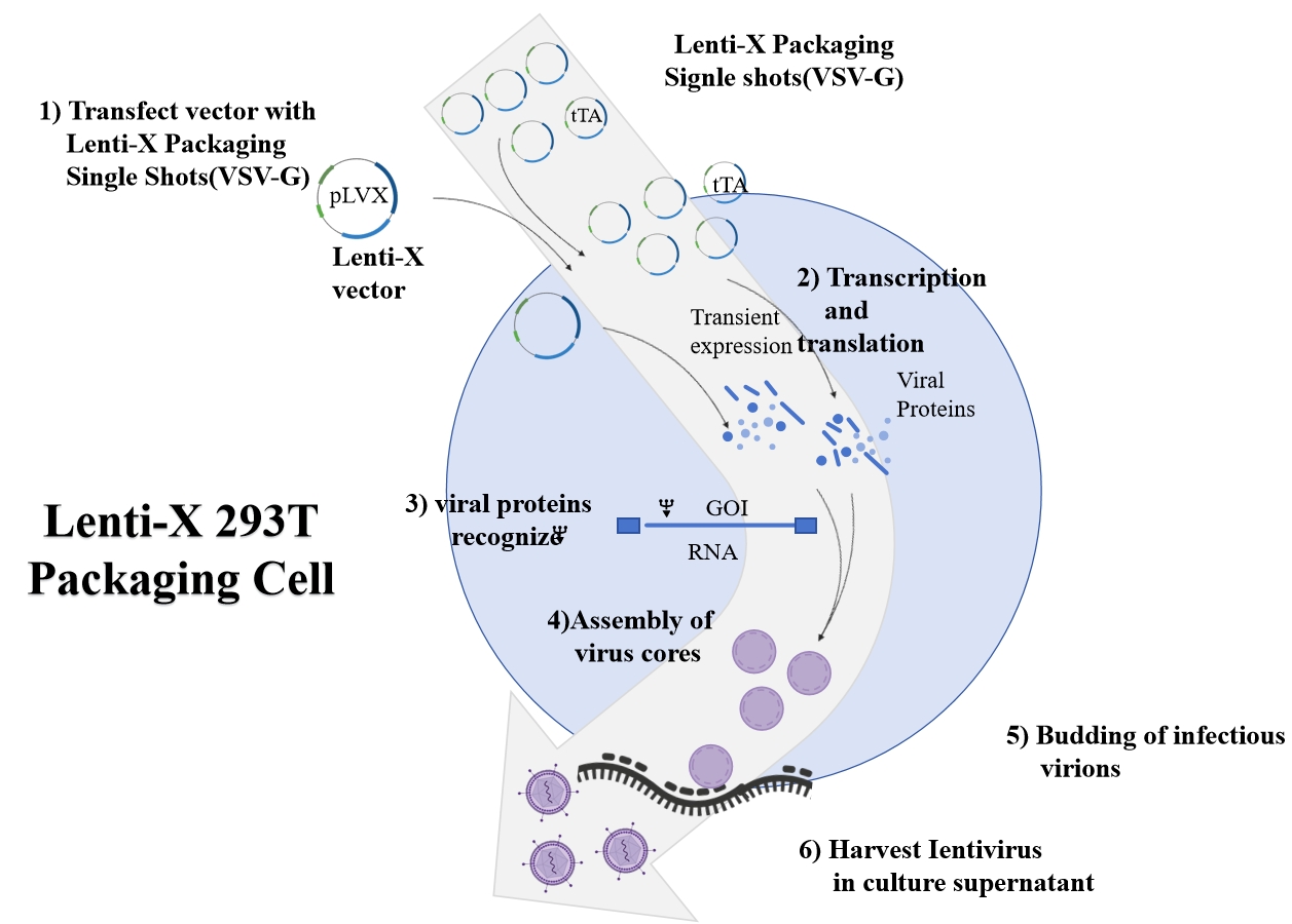 慢病毒(LV)是一種有包膜的病毒,最常見(jiàn)的是VSV-G,它通過(guò)與特定的細(xì)胞表面蛋白(比如LDLR)結(jié)合,隨后進(jìn)行膜融合進(jìn)入細(xì)胞,將含有其遺傳信息的病毒RNA注入細(xì)胞質(zhì)。這種單鏈病毒RNA通過(guò)逆轉(zhuǎn)錄轉(zhuǎn)化為DNA。病毒DNA進(jìn)入細(xì)胞核,并通過(guò)病毒整合酶整合到宿主細(xì)胞基因組中。
