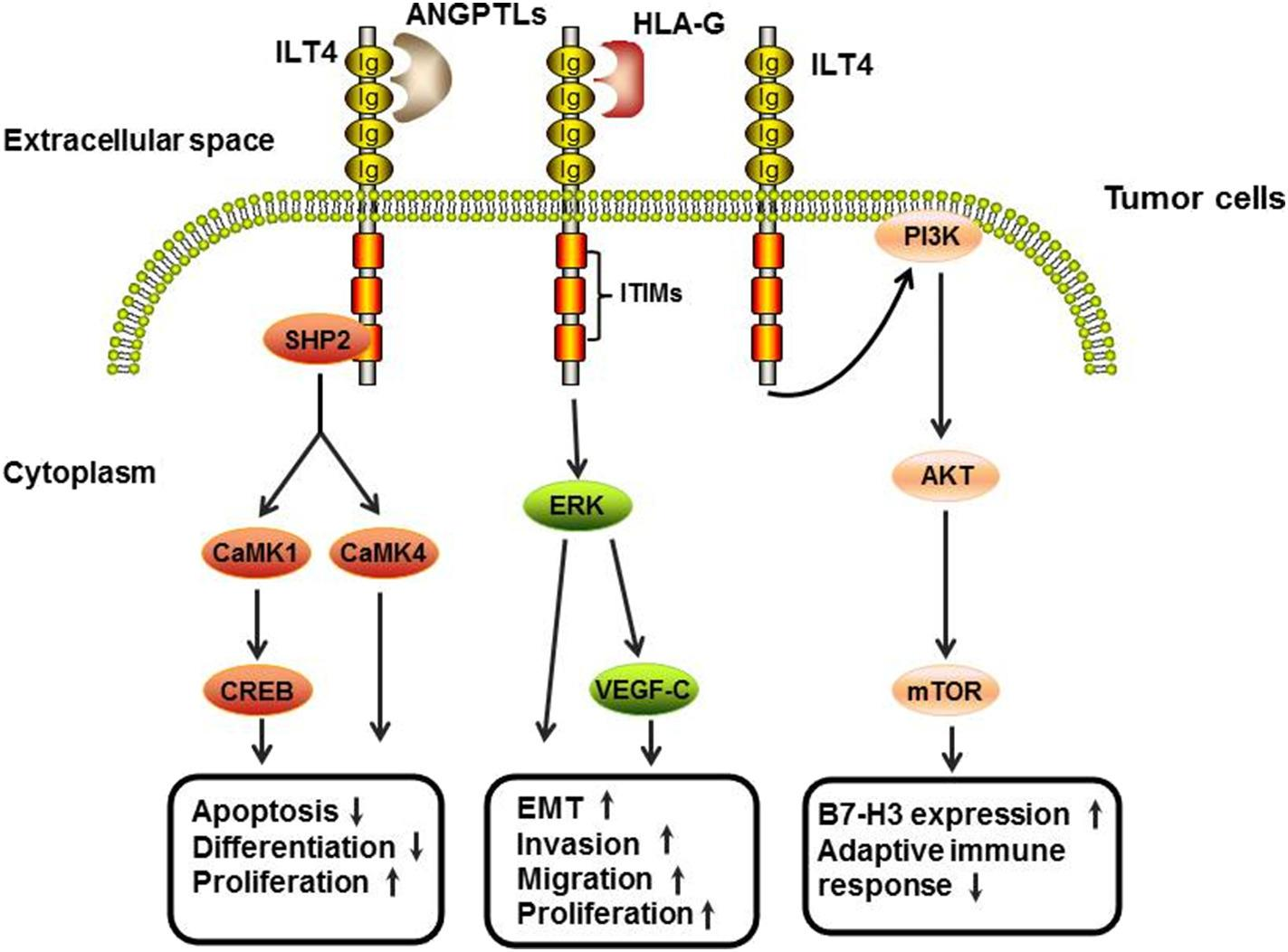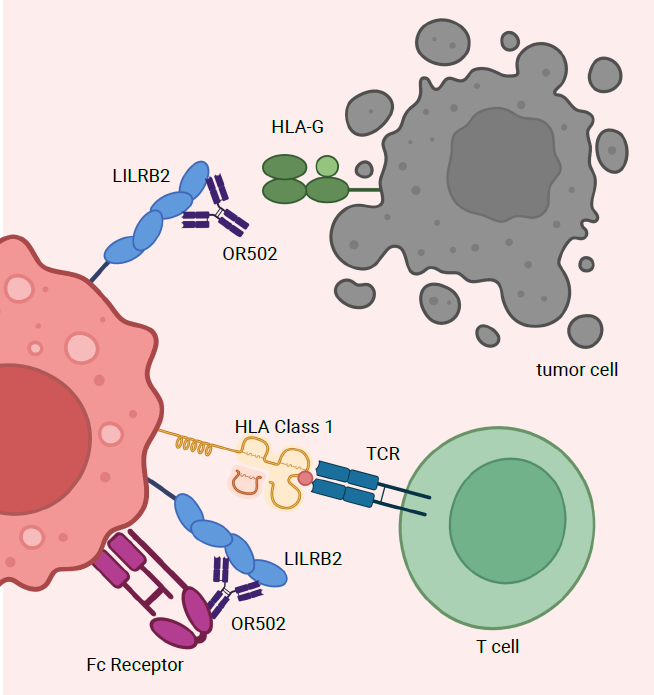 LILRB2主要表達(dá)于髓系細(xì)胞(如單核細(xì)胞、巨噬細(xì)胞、樹突狀細(xì)胞)和某些腫瘤細(xì)胞。它通過(guò)與配體(如HLA-G、ANGPTLs、SEMA4A和CD1d)結(jié)合,傳遞抑制性信號(hào),抑制免疫細(xì)胞的活性,促進(jìn)腫瘤免疫逃逸。