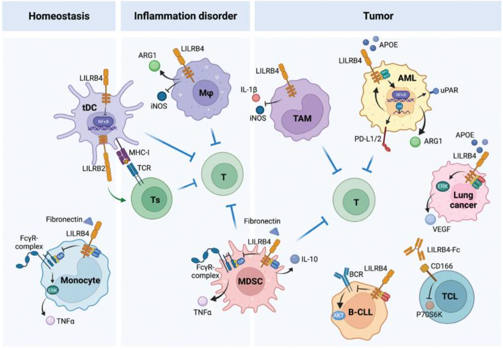 LILRB4可通過(guò)NF-kB信號(hào)傳導(dǎo)導(dǎo)致細(xì)胞凋亡,并通過(guò)降低磷酸酶(SHP)1磷酸化激活NF-kB信號(hào)傳導(dǎo)導(dǎo)致炎癥。LILRB4在多種腫瘤細(xì)胞中表達(dá),包括實(shí)體瘤和血液腫瘤。LILRB4還是單核細(xì)胞白血病的重要標(biāo)志物,通過(guò)ApoE/LILRB4/SHP-2信號(hào)軸在急性髓系白血病(AML)細(xì)胞中支持腫瘤細(xì)胞浸潤(rùn)到組織中并抑制T細(xì)胞活性。因此,LILRB4是治療單核細(xì)胞急性髓細(xì)胞白血病的重要靶點(diǎn)。在肺癌細(xì)胞中,LILRB4被APOE結(jié)合激活,并募集SHP-2和SHIP-1激活ERK1/2信號(hào)傳導(dǎo)并增加血管內(nèi)皮生長(zhǎng)因子(VEGF)的表達(dá)以促進(jìn)癌癥轉(zhuǎn)移。