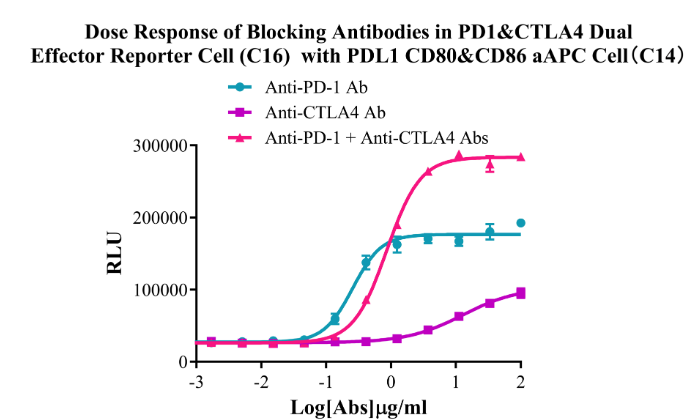 Figure 6. Dose Response of Blocking Antibodies in PD1&CTLA4 Dual Effector Reporter Cell (C16) with PDL1 CD80&CD86 aAPC Cell(C14).
