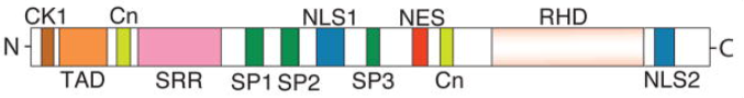 在人類中,NFAT家族由五個(gè)不同的基因產(chǎn)物組成,命名如下:NFAT1(也稱為NFATc2和NFATp);NFAT2(也稱為NFATc1和NFATc);NFAT3(也稱為NFATc4);NFAT4(也稱為NFATc3和NFATx)和NFAT5(也稱為TonEBP和OREBP)。鈣調(diào)控的經(jīng)典NFAT蛋白(NFAT 1-4)由多個(gè)功能模塊組成,這些模塊決定了蛋白質(zhì)的磷酸化、核內(nèi)定位、DNA結(jié)合以及目標(biāo)基因的轉(zhuǎn)活化。N端區(qū)域包含調(diào)控結(jié)構(gòu)域,包括酪蛋白激酶1(CK1)對(duì)接位點(diǎn)、轉(zhuǎn)活化結(jié)構(gòu)域(TAD)和鈣煜氨酸(Cn)對(duì)接位點(diǎn)。C端包含DNA結(jié)合的Rel同源結(jié)構(gòu)域(RHD)和一個(gè)額外的鈣化神經(jīng)素對(duì)接位點(diǎn)。蛋白質(zhì)中間有幾個(gè)富含絲氨酸的結(jié)構(gòu)域(SRR、SP1-3),為靶向NFAT的激酶提供磷酸化位點(diǎn)。此外,NFAT蛋白包含兩個(gè)調(diào)控其亞細(xì)胞定位的信號(hào)序列:核定位信號(hào)序列(NLS1和NLS2)和核輸出信號(hào)(NES)。與經(jīng)典的NFATc蛋白不同,NFAT5(也稱為強(qiáng)張?jiān)鰪?qiáng)蛋白結(jié)合蛋白)不依賴鈣神經(jīng)素或核伴侶即可發(fā)揮活性。