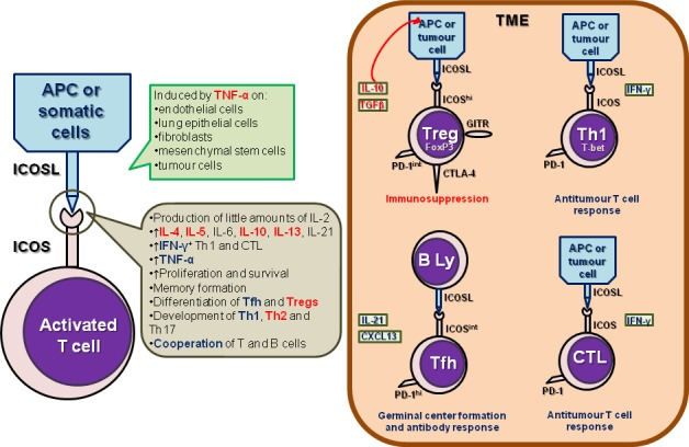 與CD28途徑相反,ICOS共刺激導(dǎo)致活化的T細(xì)胞產(chǎn)生低效的IL-2;然而,包括IL-4、IL-10和IL-21在內(nèi)的其他細(xì)胞因子通常更有效地被誘導(dǎo)。這賦予了ICOS在激活早期調(diào)節(jié)Th細(xì)胞亞群分化的特定作用。ICOS信號傳導(dǎo)的需求在Treg和卵泡Th細(xì)胞(Tfh)分化中得到了最多的研究。ICOS在PD-1hi CXCR5hi的人扁桃體Tfh細(xì)胞上高度表達(dá),其功能是促進高親和力抗原特異性B細(xì)胞反應(yīng)。在外周血中,CD25hiFoxP3+Treg表達(dá)最高水平的ICOS,ICOS+循環(huán)Tfh亞群在自身免疫性疾病中顯示增加。此外,Th2和Th17亞群的分化也依賴于ICOS,并且ICOS共刺激可以有效誘導(dǎo)Th1細(xì)胞因子的表達(dá)。