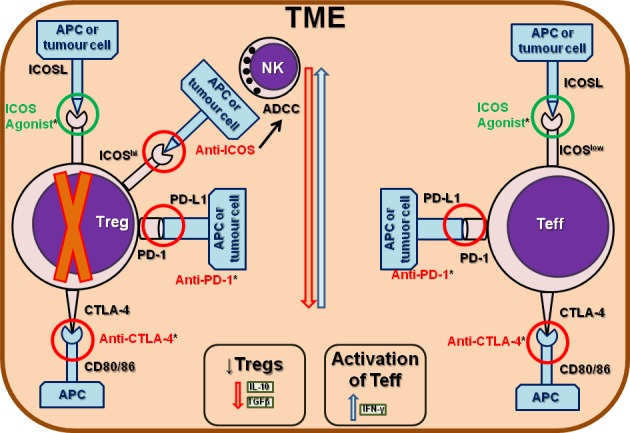ICOS/ICOSL信號途徑已被證明可以促進抗腫瘤T細(xì)胞反應(yīng)(當(dāng)在Th1和其他Teff中激活時)或Tregs中觸發(fā)的前體反應(yīng)。因此,針對這一途徑的激動性和拮抗性單克隆抗體正在被研究用于癌癥免疫療法。在臨床前研究中,ICOS激動性單克隆抗體增強了抗CTLA-4的作用。有文獻表明ICOS敲除小鼠對抗CTLA-4反應(yīng)不佳,表明ICOS信號傳導(dǎo)是有效抗腫瘤反應(yīng)所必需的,可能由Teff介導(dǎo)。因此,與單獨使用抗-CTLA-4相比,同時使用CTLA-4和ICOS刺激具有更好的抗腫瘤效果。有趣的是,使用抗-CTL a-4或抗-PD-1治療的小鼠和患者擴大了ICOShi(FoxP3-)CD4+和CD8+T細(xì)胞亞群,表明ICOShi T細(xì)胞可能是臨床反應(yīng)的重要生物標(biāo)志物,從而使治療受益。與癌癥免疫療法靶向的其他途徑相比,單獨使用ICOS似乎效果較差,主要是因為CD4+Tregs占主導(dǎo)地位。使用ICOS激動劑或拮抗劑Abs與CTLA-4或PD-1/PD-L1聯(lián)合使用有可能產(chǎn)生強效的協(xié)同作用。
