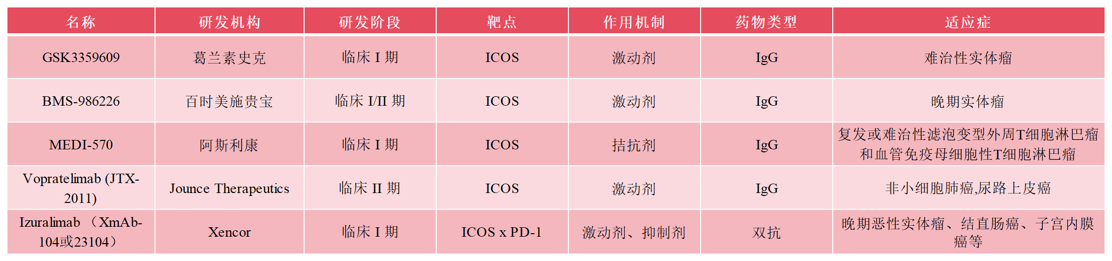 ICOS/ICOS-L信號通路在腫瘤領(lǐng)域具有雙重作用。一方面,ICOS/ICOS-L的共刺激信號可參與抗腫瘤T細(xì)胞反應(yīng)。另一方面,ICOS信號傳導(dǎo)也具有促腫瘤作用?,F(xiàn)階段正在研發(fā)的ICOS抗體主要包括激動劑和拮抗劑兩種。激動劑主要通過和ICOS結(jié)合增強免疫作用。拮抗劑主要是為了阻止調(diào)控ICOS陽性T細(xì)胞累積,抑制CD4+浸潤性T細(xì)胞分泌IL-10,以此消除Treg介導(dǎo)的免疫抑制,并可能增強針對腫瘤細(xì)胞的細(xì)胞毒性T淋巴細(xì)胞(CTL)介導(dǎo)的免疫應(yīng)答,主要用于血液癌癥。目前在全球范圍內(nèi)尚無針對ICOS靶點的藥物獲批上市。目前部分藥企研發(fā)進展如下: