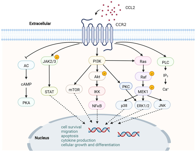通過(guò)結(jié)合CCL2,CCR2經(jīng)歷二聚化和內(nèi)化,誘導(dǎo)單核細(xì)胞趨化蛋白-1誘導(dǎo)蛋白-1(MCPIP1)的表達(dá)。隨后,MCP1P1開(kāi)始轉(zhuǎn)錄和表達(dá)IL-1、CCL2和TNF基因。當(dāng)CCL2觸發(fā)CCR2時(shí),會(huì)啟動(dòng)多種細(xì)胞內(nèi)G蛋白介導(dǎo)的信號(hào)通道,例如JAK/STAT、PI3K/MAPKs和PI3K/Akt/ERK/NF-κB。這些信號(hào)通路的激活會(huì)激活多種轉(zhuǎn)錄因子和基因,這些因子參與細(xì)胞因子產(chǎn)生、細(xì)胞生長(zhǎng)與分化、細(xì)胞存活、遷移與凋亡、血管生成及炎癥。CCL2-CCR2軸與多種疾病的進(jìn)展相關(guān),如動(dòng)脈粥樣硬化、急性肝衰竭、類風(fēng)濕性關(guān)節(jié)炎、肺動(dòng)脈高壓、糖尿病及并發(fā)癥以及癌癥。因此,CCL2-CCR2軸被認(rèn)為是此類疾病管理的潛在靶點(diǎn)。