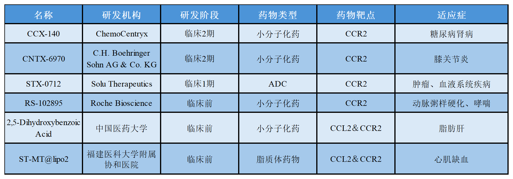 關(guān)于CCL2-CCR2在研的部分藥物進(jìn)展如下表所示: