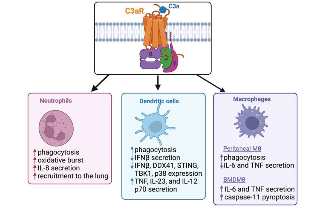 C3aR是G蛋白偶聯(lián)受體(GPCR)家族的成員,其特征是具有七個(gè)跨膜結(jié)構(gòu)域?;谕吹腉蛋白對(duì)C3aR的分類一直具有挑戰(zhàn)性。G蛋白是異三聚體復(fù)合物,在GPCR激活時(shí)解離為Gα和Gβγ亞基。這種解離促進(jìn)了通過(guò)第二信使如cAMP和鈣的產(chǎn)生以及下游信號(hào)的調(diào)控。雖然文獻(xiàn)中有些證據(jù)表明C3aR激活會(huì)觸發(fā)Gαi家族,但其他研究表明Gαs和Gαq參與其中。最近一項(xiàng)研究發(fā)現(xiàn),C3aR主要與Gαi/o/z亞型耦合,以抑制cAMP積累并介導(dǎo)鈣回流。C3aR激活下游最常被報(bào)道的影響是細(xì)胞內(nèi)鈣的增加,但其他分子通路如GSK3β、Wnt、ERK、JAK/STAT和HIF1α信號(hào)也被發(fā)現(xiàn)位于C3aR激活的下游。