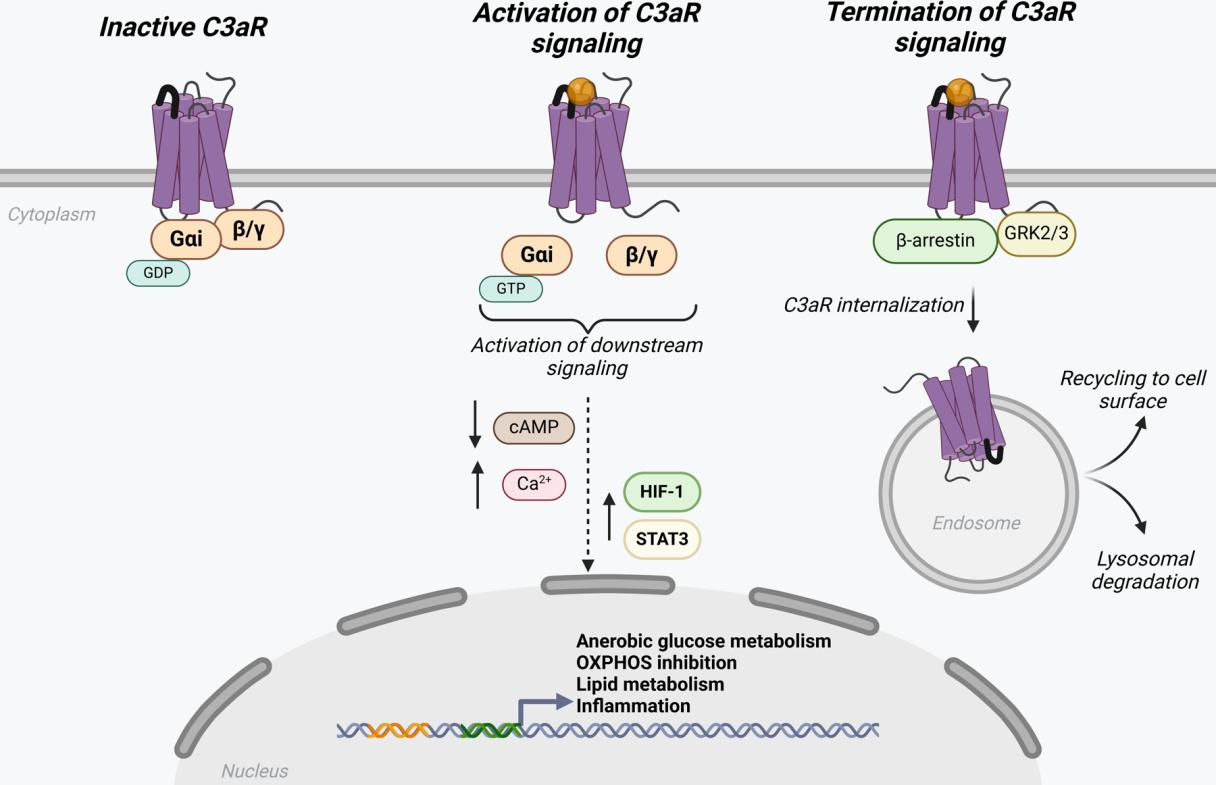 在無(wú)活性狀態(tài)下,C3aR與異三聚體G蛋白復(fù)合物的Gαi亞家族結(jié)合。配體結(jié)合(C3a或TLQP-21)后,附著在Gαi上的GDP轉(zhuǎn)化為GTP,導(dǎo)致亞基解離成Gαi和Gβγ。這種解離啟動(dòng)下游信號(hào)級(jí)聯(lián),抑制腺苷酸環(huán)化酶,降低cAMP水平,增加鈣通量。在下游,C3aR激活激活STAT3和HIF-1等轉(zhuǎn)錄因子,啟動(dòng)與炎癥、脂質(zhì)代謝、葡萄糖代謝和OXPHOS抑制相關(guān)的基因轉(zhuǎn)錄。為了終止這一信號(hào)級(jí)聯(lián),GRK2/3磷酸化C3aR的胞質(zhì)環(huán)和尾部,促進(jìn)β-阻滯蛋白識(shí)別并與受體結(jié)合。β-抑制蛋白結(jié)合觸發(fā)受體復(fù)合物的內(nèi)化,然后在核內(nèi)體進(jìn)行分類。該復(fù)合體要么被引導(dǎo)到循環(huán)內(nèi)體,受體再循環(huán)到細(xì)胞表面,要么被送到溶酶體降解。